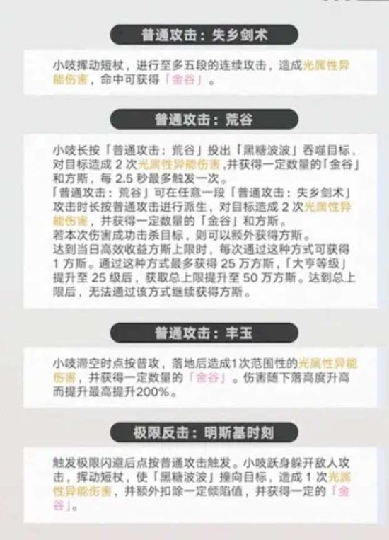 小吱长按普通攻击荒谷可投出黑糖波波吞噬目标,对目标造成两次光属性异能伤害,并获得一定数量的金谷和方斯,每2.5秒最多触发一次。荒谷可在任意一段普通攻击失乡剑术攻击时长按进行派生,对目标造成两次光属性异能伤害,获得一定数量的金谷和方斯。若本次伤害成功击杀目标,则可额外获得方斯。达到当日高效收益方斯上限时,每次通过这种方式可获得1方斯,最多获得25万方斯。大亨等级提升至25级后,获取总上限提升至50万方斯,达到总上限后无法通过该方式继续获得方斯。