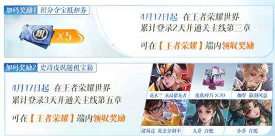 积分夺宝券:在《王者荣耀世界》累计登录2天并通关主线第三章后,可在《王者荣耀》领取。