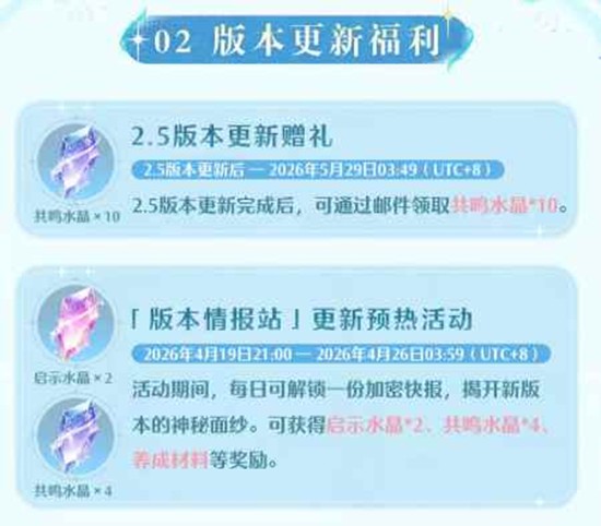 活动期间,每日将解锁一份加密快报,搭配师们可逐步揭开2.5版本的神秘面纱,提前了解新版本内容。参与解密即可领取启示水晶、共鸣水晶及各类养成材料等实用奖励。