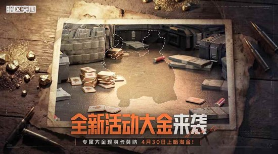 《暗区突围》官方正式宣布,五一特别活动"上暗淘金,狂热暴富"将于4月30日震撼上线。本次活动以淘金为主题,将为广大先锋带来包括全新金色品质涂装免费送、全新活动大金、海量福利以及秘宝猎人主题活动等重磅内容,助力玩家在五一小长假期间狂揽物资,暴富突围。