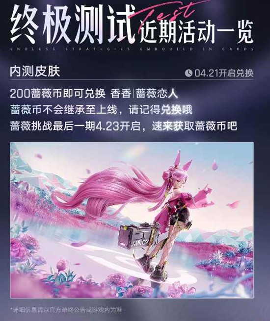 这是测试结束前最后一次获取蔷薇币的机会!尚未攒够200币兑换皮肤的棋手,请务必参与4月23日开启的最后一期挑战,完成指定任务获取蔷薇币,赶在测试结束前兑换心仪奖励。