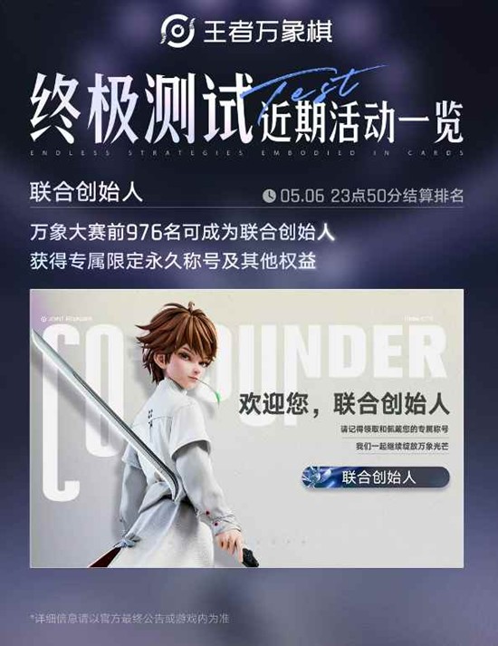 距离结算仅剩半月,各位冲榜棋手请把握最后时机提升排名,争夺成为游戏正式上线后的"联合创始人"资格,获得永久彰显身份的专属称号。
