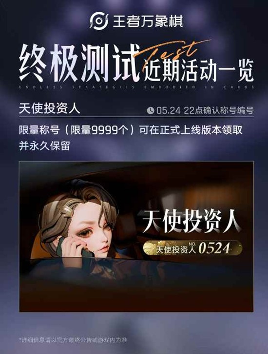 "天使投资人"称号作为终极测试另一大限量荣誉,将在5月24日确认编号归属。获得该称号的棋手可在游戏正式上线后永久展示这一珍贵身份标识。