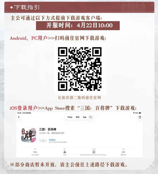 4月22日上午10点,《三国:百将牌》正式开服。建议玩家提前完成预下载与资源更新,确保开服第一时间进入游戏,抢占先机。三分钟,牌一把,这场三国技能打牌之旅即将启程,各位牌手准备好了吗。