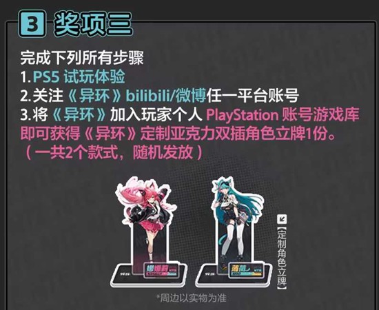 完成PS5试玩体验并关注《异环》bilibili或微博任一平台官方账号后,将《异环》加入个人PlayStation账号游戏库,即可获得《异环》定制亚克力双插角色立牌1份。立牌共2个款式,随机发放。