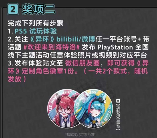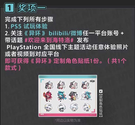 完成PS5试玩体验,并关注《异环》bilibili或微博任一平台官方账号,带话题#欢迎来到海特洛#发布PlayStation全国线下主题活动任意体验照片或视频至对应平台,即可获得《异环》定制角色贴纸1份(共1个款式)。