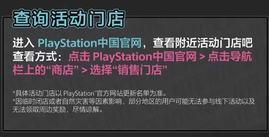 玩家可进入PlayStation中国官网,点击导航栏"商店"后选择"销售门店",查询附近参与活动门店的具体地址。官方提示,具体活动门店以PlayStation官方网站更新名单为准,因临时闭店或自然灾害等因素,部分地区用户可能无法参与线下活动,敬请谅解。