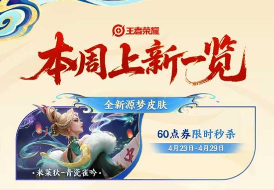 MOBA手游王者荣耀本周将迎来新一轮内容更新,米莱狄全新源梦系列皮肤「青瓷雀吟」正式上线,同时星币兑换行、峡谷语音包上新及《王者荣耀世界》联动福利等多项活动同步开启。