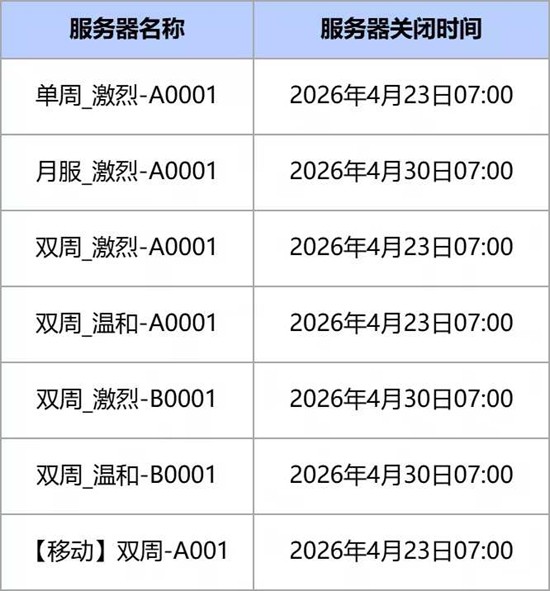 2026年4月23日版本更新前已开启的服务器将正常运行至服务器自然结束,结束后不再重启,相关的服务器列表如下: