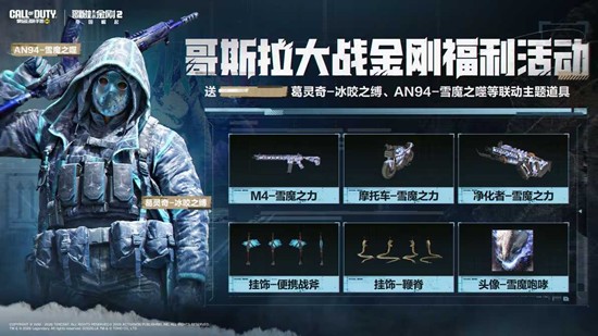参与「巨兽冲击」联动活动,可免费获取史诗级角色「葛灵奇-冰咬之缚」及史诗级武器「AN94-雪魔之噬」等限定奖励。