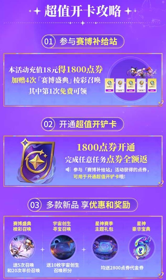 官方同步上架【赛博补给站】礼包,售价18元。购买后立得1800点券,并额外获赠4次【赛博盛典】棱彩召唤次数(含首次免费)。所得1800点券可直接用于解锁【超值开铲卡】,实现"买一得二"——既完成开铲卡解锁,又额外获得多次限定召唤机会,大幅降低了赛季初期的养成成本。