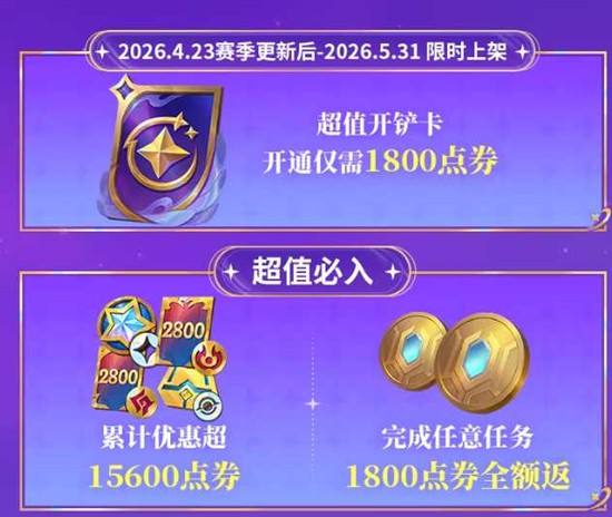 金铲铲之战新赛季即将于4月23日更新,伴随赛季启程,官方重磅推出【超值开铲卡】限时活动。该活动将于2026年4月23日赛季更新后持续至5月31日,以超高性价比回馈广大弈士,首期累计优惠幅度超过15600点券,堪称本赛季最具诚意的福利活动之一。