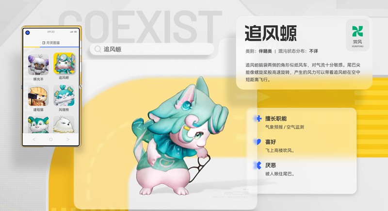 追风螈具备巽风属性,头部两侧有纸风车形状的角,对气流极为敏感。尾巴尖能像螺旋桨般高速旋转,使其产生短距离飞行的效果。它的主要功能是对天气和空气质量进行实时预报与监测,为玩家提供出行前的天气状况和空气质量信息,方便出行安排。追风螈喜欢飞上高楼吹风,享受气流拂过的感觉,但非常讨厌被人揪住尾巴,因此玩家在互动时应保持适当距离,尊重其生活习性。
