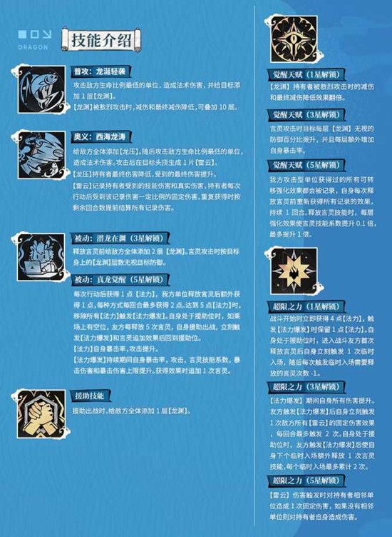 5星被动【真龙觉醒】与超限之力构建【法力】体系:行动与友方释放言灵积累法力,满5点触发【法力爆发】,大幅提升自身暴击、攻击、言灵系数与暴伤上限,并追加言灵。1星超限开局即获4点法力,援助位可在友方首次释放言灵后临时入场,实现高频爆发。