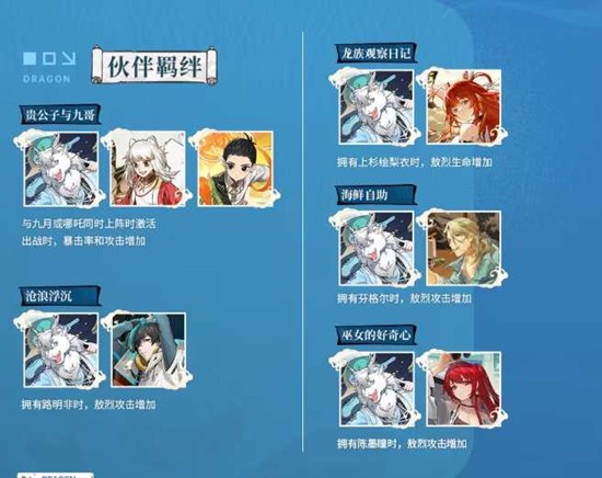 敖烈与九月/哪吒同时上阵激活暴击与攻击加成;拥有路明非、芬格尔、陈墨瞳可进一步提升攻击,拥有上杉绘梨衣则增加生命,羁绊覆盖面广,易于融入现有体系。