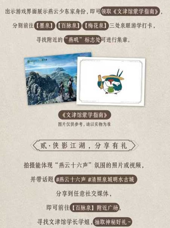 除了沉浸式的场景联动,本次活动还设置了丰富的互动打卡环节。游侠们在明水古城内完成指定打卡任务,即可赢取联动限定好礼。限定周边将《燕云十六声》的武侠元素与明水古城的文化符号巧妙融合,兼具收藏价值与纪念意义,值得每一位玩家亲自前往解锁。具体打卡点位、互动形式及奖励详情将在活动开启后于现场及官方渠道同步揭晓。