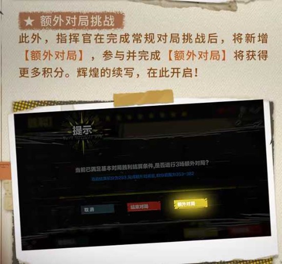 指挥官在完成常规对局挑战后,将新增【额外对局】选项。参与并完成额外对局将获得更多积分,为冲榜提供额外燃料,辉煌的续写在此开启。
