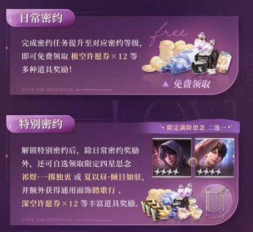 解锁特别密约后,除日常密约奖励外,还可自选领取限定四星思念「祁煜·一掷独衷」或「夏以昼·倾目如驻」其一,并额外获得通用面饰「踏歌行」、「深空许愿券×12」等丰富道具奖励。