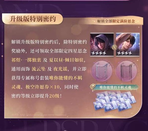 解锁升级版特别密约后,除特别密约全部奖励外,还可直接领取全部限定四星思念「祁煜·一掷独衷」及「夏以昼·倾目如驻」,同时获得通用面饰「流云坠」及「夜光谣」、专属称号套装「唯你能懂的不羁灵魂」、「极空许愿券×10」,并立即提升密约等级20级!