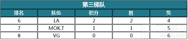 在第三梯队中,LA以2胜4负的成绩暂时领跑,而这里还出现了最不应该出现的MOK.T的战队,要知道他们可是职业联赛夏季赛常规赛的亚军、季后赛的季军,现在1胜5负的战绩,估计他们自己都不知道是为什么。而VG战队经过了队伍大换血之后,似乎接过了上赛季SG的枪,到现在一分未得,十分凄惨。