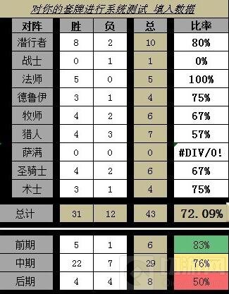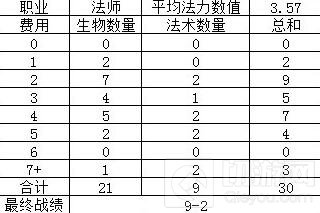 这样的一套牌,应该会是比较稳定,也比较顺手的防守反击式套牌,接下去一段时间里,我会遵循这样的原则,集中在竞技场里练习一番并加以记录,看看是否足以打造出最佳竞技场卡组类型,有人有兴趣的话也可统计一下,不需要具体的卡组,而是统计平均法力曲线,各种费用卡牌多少张数,其中多少张生物,多少张法术,选用的职业,最终战绩。大概的格式如下。