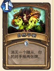 目前为止这张卡牌的出场率并不是很高。即便如此我觉得在常规卡组当中它也不算 特别的烂,特别是考虑到德鲁伊自身缺乏移除法术这一点,自然平衡在爆牌德卡组当中可以说是非常的出色。总体来说,你需要不断的清理对手场上的随从,在这个 过程之中你还需要尽量不让自己受到伤害,并且加速敌人的疲劳。自然平衡完全适合这套卡组的目标。