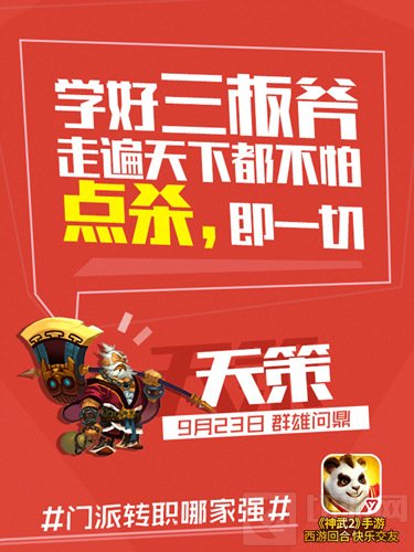 《神武2》手游全新内容“群雄问鼎”将于9月23日正式开启。早前关于全新地图桃花岛、四大全新宠物等内容已在游戏里逐步更新,9月23日即将上线的,是最受玩家期待的全新玩法——转职玩法!想体验其他门派的酷炫技能,那就快来试试吧!