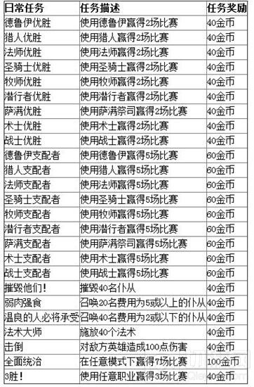 每天完成日常任务视日常难度将可获得40或100金币,而某些较为简单的一次性任务也 奖励价值不菲的金币或者卡包,对于初始玩家来说可是起步的关键,谨慎规划你的金币使用!要知道除了竞技场之外你唯一的金币来源只有完成一次性或者日常任务,以及在对战模式赢得5场比赛后所奖励可怜巴巴的5金币。而一些较难的任务奖励的则是独特的卡牌或者金色卡牌!但是难度比起其他任务则是不可同日而语 了。
