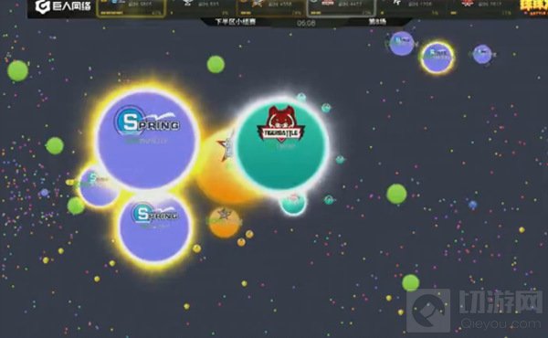 开局大家都是扎刺和吃彩豆发育,并没有发生什么冲突。FT在扎刺之后遇到了SPR,一个16分打空。随后FLY合球失误,被CMD吃掉了一定的大球。