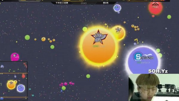 STS和FT又相遇了。STS面对FT的踏球也很冷静,逃跑之后运用骗球吃掉了SOH,STS吃掉了SOH之后,不小心扎刺之后在次被FT吃掉了自己的大分身,恭喜FT赢得第一局的胜利。