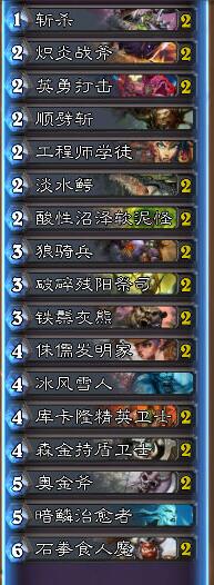 其他随从牌:前期用小随从占场,对手随从用法术或武器解掉。中后期优先上大随从,对手没有使用群体法术(如烈焰风暴)前,切忌铺太多小怪。