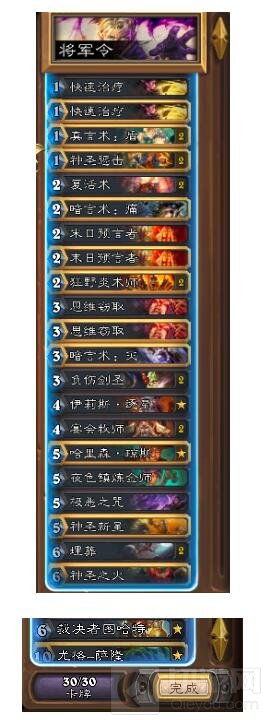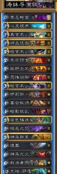 每个人适合的卡组不一样,所以我对金将军的卡组进行了一下微调,让卡组更适合自己,没想到对天梯的抗性居然不错,最后打到一级,但是渡劫三次全部以失败告终,接着就自暴自弃了。后来才知道,涛妹渡劫的时候并不是使用这套牧师,一时间不知道应该说些什么才好。