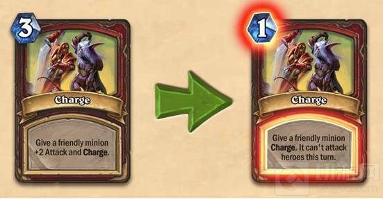 冲锋从3费变为1费“目标友方随从获得冲锋,它本回合不能攻击英雄”:看上去这个改动简直有点无厘头,狼人战或者奥术巨人战目前并没有强到一定要被NERF的程度,要知道,这两套牌虽然斩杀都比较凶猛,但在斩杀被改动之后,这套牌苟活以及过墙斩杀的能力都被削弱的很厉害,不过想想战歌指挥官,或许暴雪受够了冲锋BUFF的苦,索性这波一次性砍没,彻底绝了以后设计出高斩杀combo的后患?现在这样确实很弱,不过已经有国外玩家想出用猛犸人头领配合冲锋清场的配合,现在用来配合奴隶主以及苦痛侍僧也可以,随着暴雪设计有受伤效果的随从越来越多,这张牌总有一天会重新进入可用范畴。