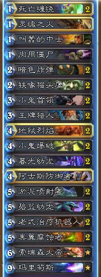 获得胜利:有些控制套牌(比如龙骑士或者城墙德)是只能控场的,然而这套牌有可以击杀对手的combo:玛里苟斯+灵魂火/暗色炸弹/地狱烈焰等。你可以通过慢慢拉开卡差获得胜利,不过你得时刻注意能不能斩杀对手,或者在对面解不掉大蓝龙的情况下下回合斩杀对手。