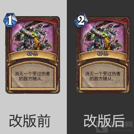 1费变2费。战士的斩杀一直是其它职业羡慕的高性价比单解,如今加了1费我相信它依旧是所有的战士必带的,只不过战士的节奏又被拖慢了一个回合,化血为脓加斩杀等之前的配合变成了3费。官网的解释是今后战士要出新的更加强大的单体去除法术。斩杀的削弱对于战士的影响相对于萨满小了很多,所以战士以后要更加加强前期的去除能力了,我觉得猛击可能是2张标配了。