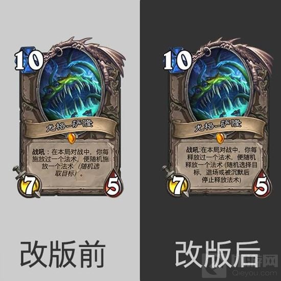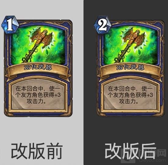 1费变2费。这种变动是最简单的,法术费用增长是减弱单卡最主要的手段之一,之前被同等原理干掉的单卡有火车王,拍卖师,女王,炎爆,精神控制,灵魂火,冰环,暴风雪,猎人印记,关门放狗,剑刃乱舞等等。这些当初的好卡大部分依旧在历史舞台上表演,但是也有永远离开我们的比如精神控制,剑刃乱舞,熔核巨人等。这次牌被改过之后的法术费用已经不再适合通常的套牌构组了,等于暴雪谋杀了他们!石化武器确实强大,改成两费也可能能够运用,不过已经不是T1级别的卡了,所以以后大家都会看到双闪电箭成为了萨满的标准配置,个人觉得实话武器可以改为只能给随从加攻击力,不能给英雄加攻击力。好吧,石化武器是开胃菜,下面是主菜了!