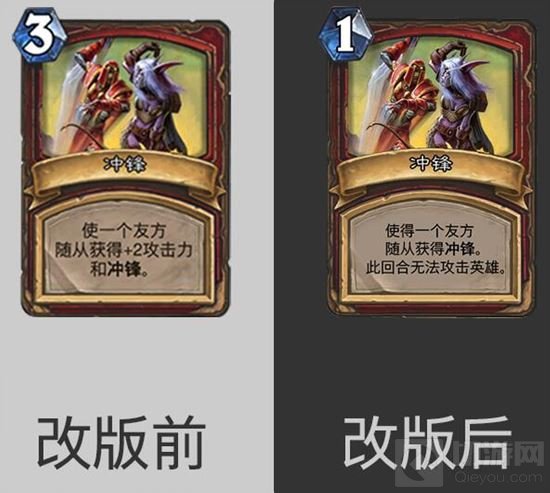 3费变为1费,不加攻击力,被buff的随从当前回合不能攻击英雄!尼玛!为啥改它?狼人战在目前环境不强啊,而且改了冲锋的功能就是说它再也不能斩杀了,再也不能有华丽的斩杀了。冲锋解怪的生物有战略意义的只能让我想到奴隶主,不过奴隶主更多需要的是自己的buff。冲锋女王,冲锋猛犸人头领?大家可以脑洞了!