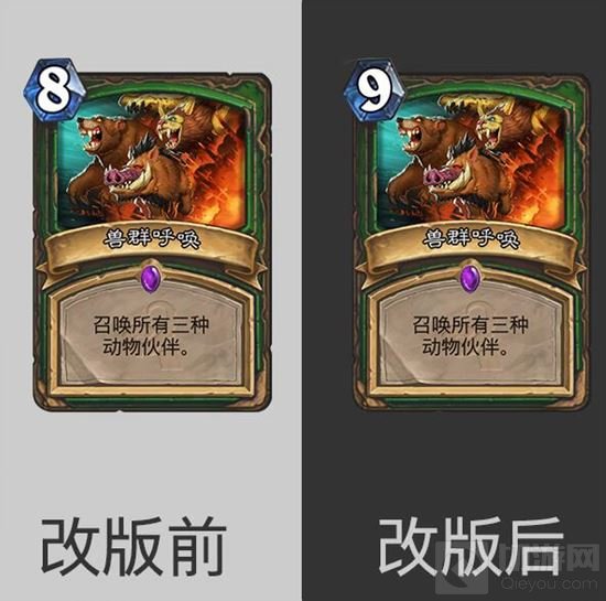 8费变9费。现在的猎人做的所有事情都是为了活到8费然后兽群的呼唤痛打对手,而爸爸让猎人必须再苟活一个回合在坚持到9费。早些年猎人这个职业强势过,后来被爸爸干了,现在兽群又加强了,然后又被爸爸干了,连续被爸爸干两次的职业并不多,恭喜猎人两次中奖!中速猎在目前环境并不是太强,虽然在天梯可能还算不错,但是在比赛中(中国的比赛中猎人出场率一直都不算高)。猎人在6费的时候狮子是一个很重要的点,之后出了兽群再压一波。然而爸爸并不喜欢猎人,所以猎人的节奏被拖慢了。我觉得不如改到10费,让兽群彻底去屎,不要让猎人的粉丝们还为了9回合的梦想而努力构筑套牌了。