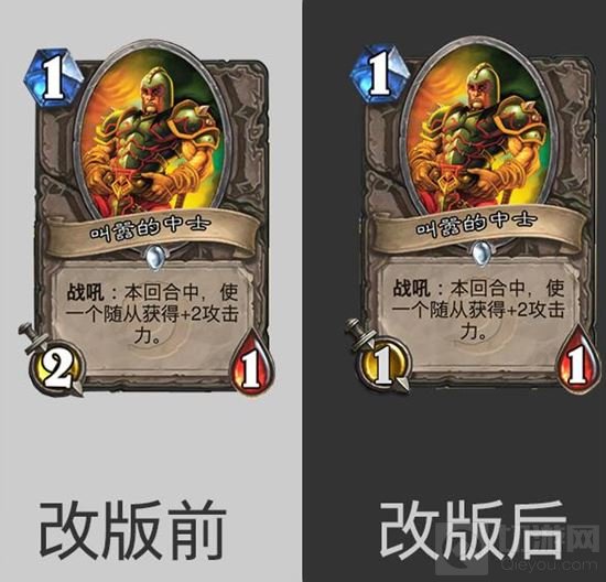 2攻变为1攻。好吧,你和麻风侏儒变成了亲戚了。现在变成了同样的身材之后对于快攻套牌稍微被削弱了一点,不过加攻击力是重点。who care!我们要的buff能力,而麻风侏儒明显是要身材和功能双赞,所以我们依旧爱叫嚣的中士。另外一方面持枪侍从的性价比是不是能够提升呢?