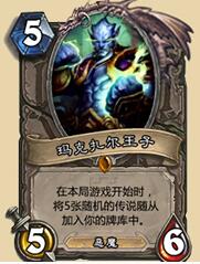 5费5/6的身材只能算一般般吧,毕竟整个炉石比这身材好的一大堆,不过加上特效:在本局游戏开始时,将5张随机的传说随从加入你的牌库中。也就是说首先这个特效的激发时间是本局游戏开始之时,只要王子在你的卡牌库中,那么这个特效就会被触发。小伙伴们整个不好了,有种中大奖的感觉,加入5张卡牌,这是要赚爆棚的节奏呀。