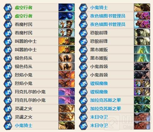 卡组介绍:由于弃牌术恶魔很多,这次Muzzy加入了恶魔之火这张曾经在动物园卡组就有奇效的单卡。比如你三个烈焰小鬼,对面拍了一个2费34,你就可以轻松buff解掉对手,而且强势站场。