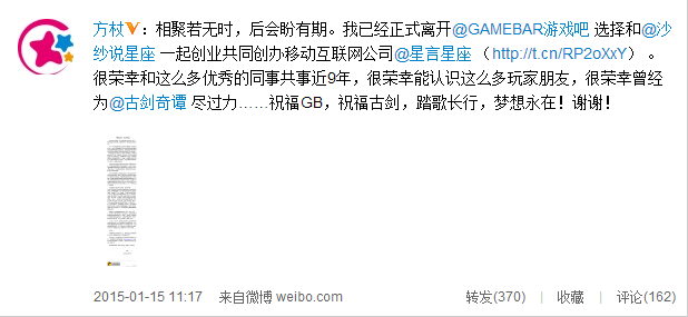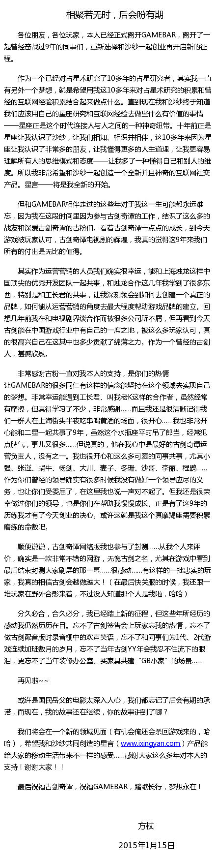 2015年1月15日上午,GAMEBAR副总裁苏飞(方杖)通过微博宣布正式从GAMEBAR离职,未来将进行星座相关业务的创业。这也是继2014年9月19日,工长君宣布离职后,又一《古剑奇谭》的核心人物宣布离开。