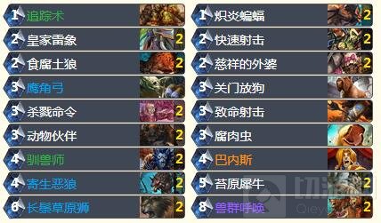 双蓝龙+馆长,现在已经是野兽德的标配了。野兽德和中速猎有一个很大的不同点:野兽德的野兽数量是略为吃紧的,首先野兽德的优质野兽比猎人少,二来野兽德的野兽不但没有赖场的亡语还往往血量较薄,站不住场。所以我建议野兽德最好带能显著加强野兽站场能力的荒野行者。