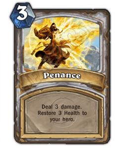 这张卡就是怒袭的翻版,但怒袭更强,因为护甲没有上限。这张卡对牧师而言还算可用,因为牧师3费没有什么东西。苦修这个技能在魔兽世界中还算挺有名的,因此可能像奥术冲击那样最终会再次利用,只是机制肯定会完全不同。最终这张卡被改成了圣殿执行者。