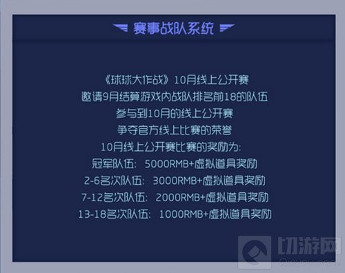 10月球球线上公开赛参赛队伍由9月战队排行榜前18名战队构成,周五为比赛日,本次赛事同样为参赛战队准备了丰富的虚拟道具奖励。球宝们想要参加比赛的话,就努力提升战队排名吧!