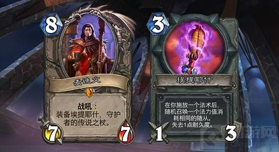 麦迪文鸡腿杖-埃提耶什:在你施放一个法术后,召唤一个法力值消耗相同的随从,失去1点耐久度。