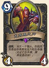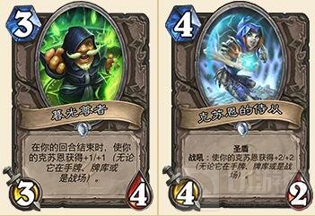 暮光尊者三费拍下多数的对手会选择尽量解掉,克苏恩信徒打2加2很好用,克苏恩侍从的高攻圣盾强势站场也有不错的表现,而克苏恩之刃作为盗贼职业卡牌集硬解、Buff主子、站场于一身,除了费用过高外没有任何缺点,在最近的慢速卡组对局中克苏恩之刃配合暗影步、毒心者返手毒药多次下场强解并Buff出巨大的克苏恩,最后克苏恩下场锁定胜局。