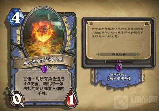 乍一看,好像没什么鸟用;仔细一看,说不定也没什么鸟用。但是各位亲,在面对一个中速萨时,早一回合清场那说不定就是10多点伤害,清了图腾不说,234图腾魔像和碧蓝幼龙也在狙击范围之内。这张超新星配合火冲可以在6费清光中速萨的绝大部分场面,而自己需要付出4血的代价,然后获得一张法师随从。就如同DOTA2的火凤凰一样,如果没有开大变蛋被打爆的觉悟,怎有落地核爆回满血的爽快?搞不好到手的就是个虚灵巫……这个煤气罐是谁给的?