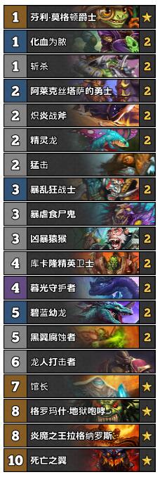 这是一套利用龙族增益和武器来控制场面的中速战士。它非常依赖强力的曲线来保持节奏并顺利过渡到后期。而像龙人打击者、吼爹、马尔考洛克和大螺丝这样的高威胁生物则给龙战中后期制胜提供了强有力的保证。