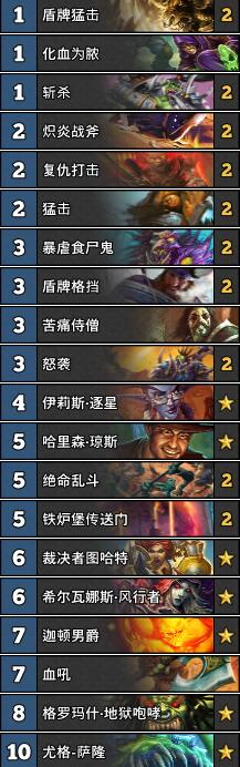 这套卡组仍然保留了吼爹激怒带走对手的手段,一个小的tips就是如果下回合准备使用盾猛来激怒吼爹,那么这回合就不能让自己的护甲超过吼爹的最大生命值。防战是一个需要考虑很多的卡组,需要经过不断的练习才能在对阵各种卡组游刃有余,而不是仅依靠右手第一张或者导演的大电影。